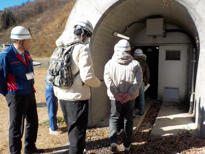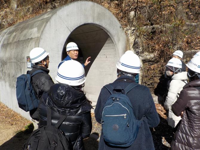 続いて、ダム建設時に岩盤強化工事で使った 「リムトンネル」を見学し、トンネルの役割に加え、気温や湿度を活かした酒類の貯蔵など、さまざまな活用方法についても詳しく説明を受けました 。