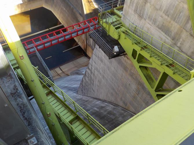 続いて、ダム最上部にある非常用の放流設備 「クレストゲート」を見学し、ゲートの役割や構造について説明を受けました。