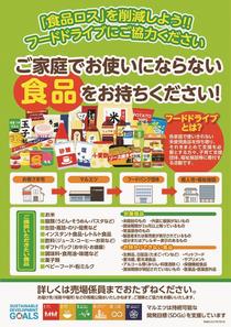・市内全店とも毎月第3月曜日から翌日曜日までの1週間、店舗でフードドライブ活動をおこなっています。ご家庭で食す予定のない食品を是非、お持ちください。お持ちいただける食品に関しては