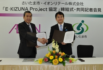 平成23年12月20日、本市とイオンリテール株式会社による「E-KIZUNA Project協定」(電気自動車(EV)の普及に関する政策協定)の締結を行いました。自動車メーカー以外と協定を締結するのは初めてで、総合スーパー「イオン」店舗網を活用したEV普及策の検討を重点項目として、以下の内容について、共同で取り組むことに合意しました。