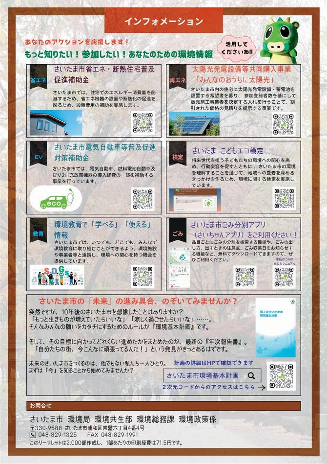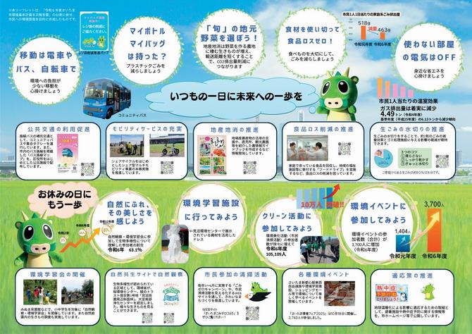 また、本報告書の公表に併せ、市民への環境啓発を目的に、環境啓発リーフレット「さいたま市の環境」を作成しました。生活の中で身近にできる取組や、市内における環境問題の現状、市の取組について紹介していますので、ぜひご覧ください。