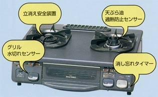 揚げ物などの料理中、油が発火温度に達する前に自動的に消火する調理油過熱防止装置(天ぷら油過熱防止装置)、使用中に火が消えた場合にガスの供給を自動的に止める立ち消え安全装置、消し忘れても点火後一定時間が経過した時点で自動的に消火する消し忘れ防止装置など、火災を未然に防ぐ安全機能を備えた調理器具です。