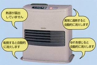 地震などの揺れを感じたりしたときに、自動的に火が消える耐震自動消火装置、機器内部の温度が異常に加熱したときに、火が消える加熱防止装置、転倒すると自動的に火が消える転倒自動消火装置があります。