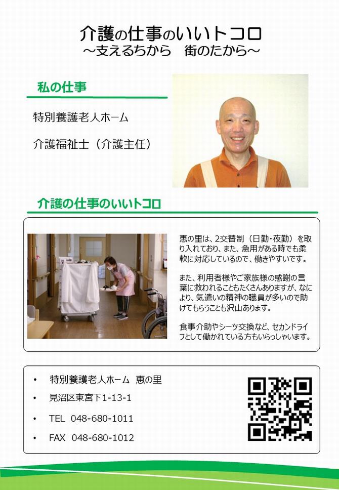 本ページの下部には、さいたま市老人福祉施設協議会が施設で働く職員が生き生きと働く様子や、プライベートでのスナップ写真をまとめた 「キラリさいたま市のかがやきびと~英姿颯爽の介護人~」がございます。こちらもご参考にしてみてください。