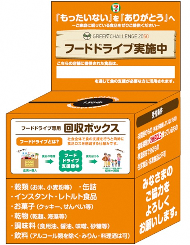 市内のセブン-イレブン店舗に設置しているフードドライブ回収ボックスに集まった食品は、市内の子ども食堂に提供されます。