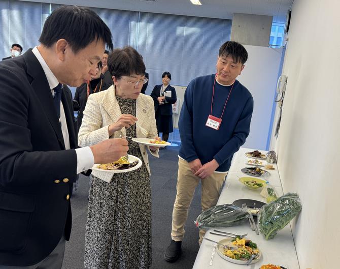 春里中学校を訪問し、「レストラン オープンセサミ」の神田智シェフが考案したイタリア料理の学校給食をいただきました。 当日の献立は「フレッシュトマトとシーフードのスパゲッティ、丸パン、牛乳、さつまいものサラダ、パンナコッタ」という、たいへん魅力的な内容でした。神田シェフにご挨拶した後、3年5組の生徒たちと会食を行いました。短い時間ではありましたが、生徒たちのクラブ活動の様子や将来の夢を聴きながら、ほたての旨味が詰まったスパゲッティや、甘味と酸味のバランスが絶妙なさつまいものサラダなど、一品一品丁寧に仕上げられた給食を味わいました。生徒に「今までで一番おいしかった給食は?」と尋ねると、「今日が一番思い出に残る!」との声が返ってきました。シェフによる特別給食が子どもたちにとって強く印象に残り、学校における食育を推進するうえで大きな意義を持つ取組であることを改めて実感しました。本市が進める全校自校方式による学校給食の魅力を、あらためて感じるひとときとなりました。