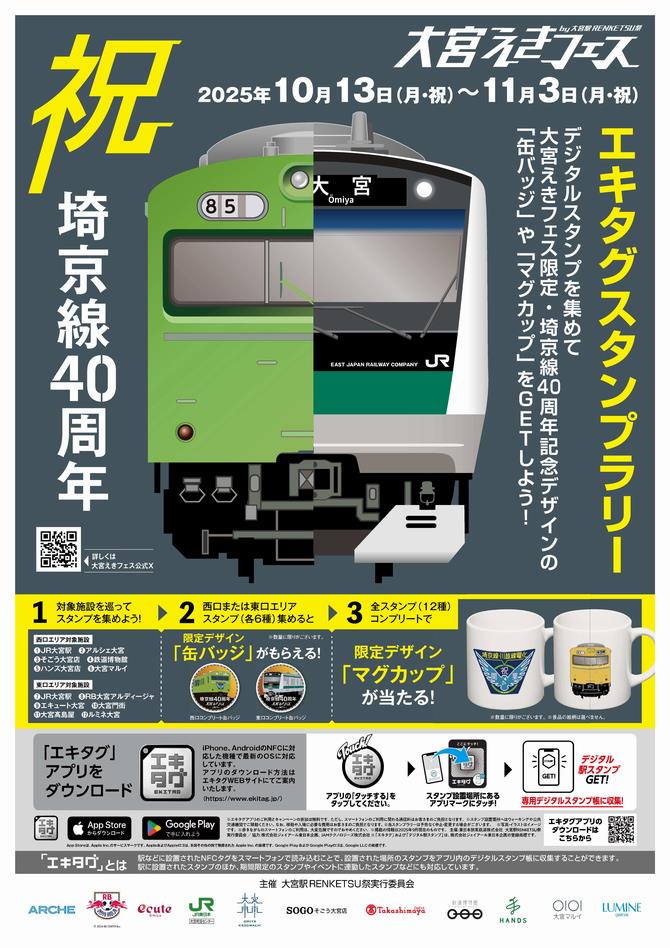 埼京線開業40周年を記念した「エキタグスタンプラリー」が開催されます。デジタルスタンプを集めて大宮えきフェス限定・埼京線40周年記念デザインの「缶バッチ」や「マグカップ」をGETしよう!