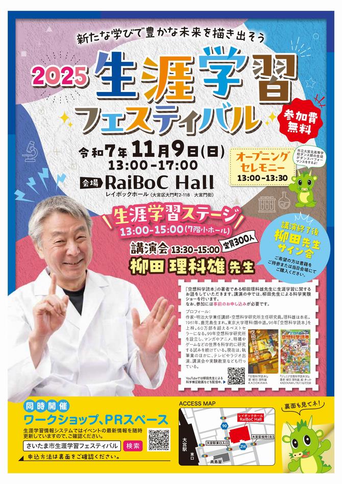 13時30分より、『空想科学読本』の著者である柳田理科雄先生に生涯学習に関するお話をしていただきます。講演の中では、柳田先生による科学実験ショーを行う予定です。