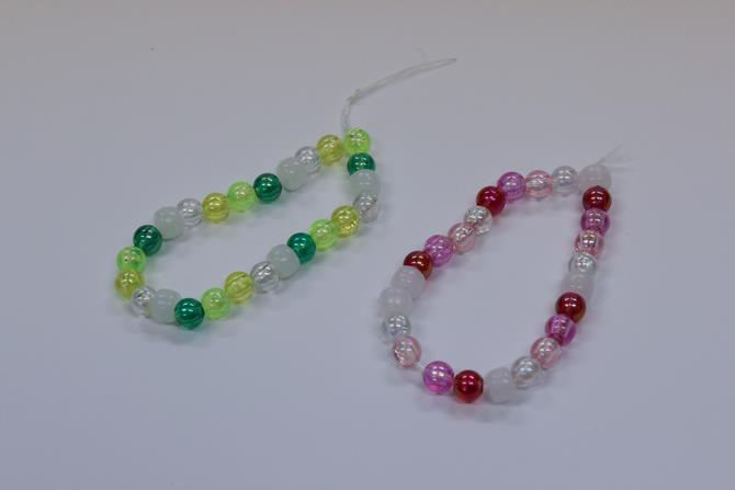 紫外線を当てると色が変わるビーズを使ってブレスレットを作ります。ブレスレットの色は赤または緑の2種類から申込時にお選びいただきます。 |