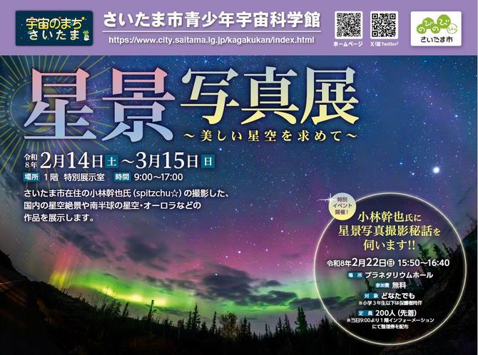 本展では、さいたま市在住の小林幹也氏(spitzchu☆)の撮影した、国内の星空絶景や南半球の星空・オーロラなどの作品を展示します。