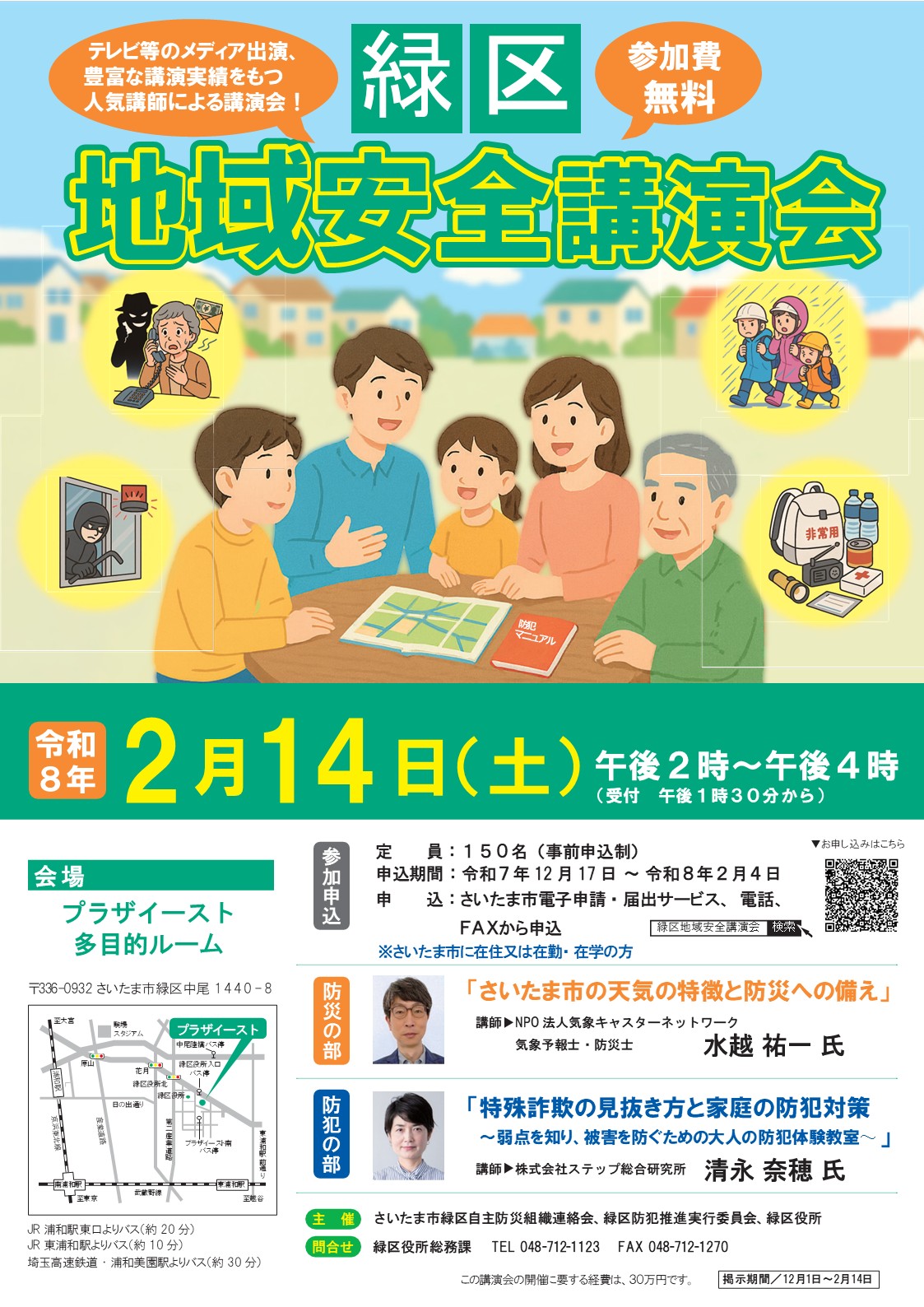 さいたま市緑区自主防災組織連絡会、緑区防犯推進実行委員会及び緑区役所の共催により、防犯と防災に対する知識の習得と意識の高揚を図り、安全で住みよい地域社会の実現を目的として以下のとおり緑区地域安全講演会を開催しました。