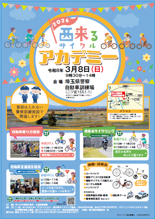 1~3の「自転車交通安全教室」、「自転車乗り方教室」、「西来るサイクリング」は事前申込制となっております。