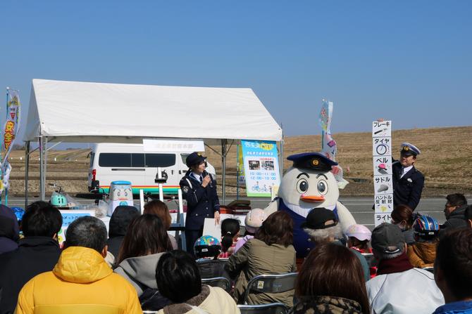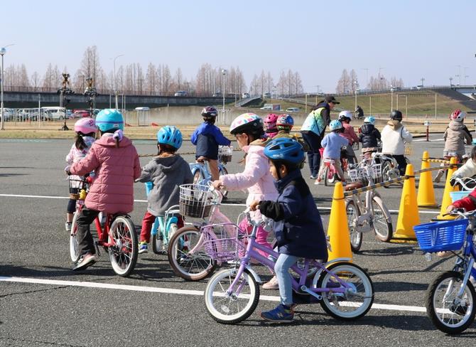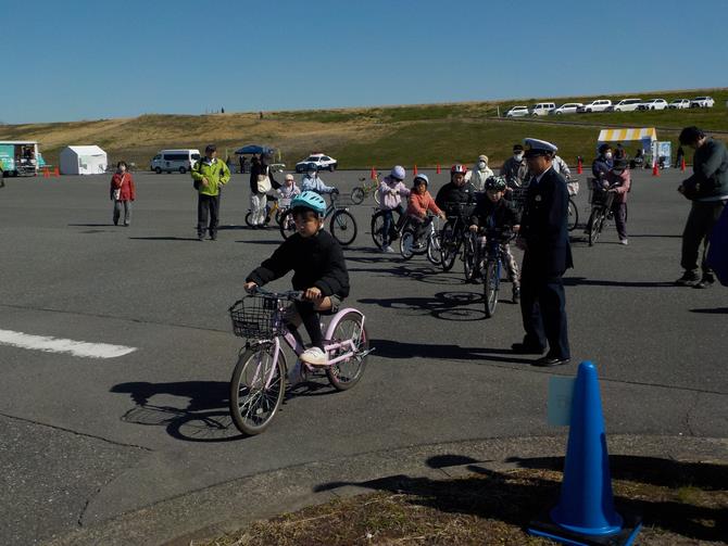 埼玉県警察本部の交通安全教育指導班「ふれあい」のみなさんの指導のもと、 訓練コースでの走行体験で、自転車の安全な乗り方を学びます。