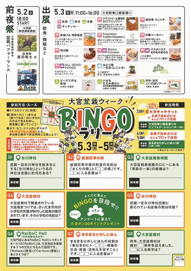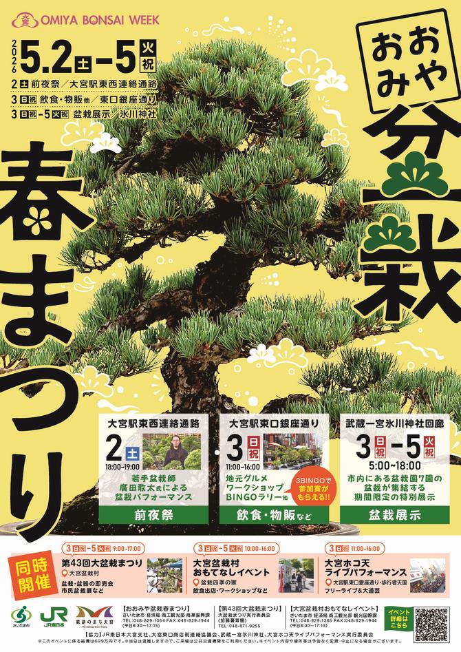 盆栽のまち大宮で、盆栽展示や地元グルメ、ワークショップなどをお楽しみいただけるイベントを開催します。
