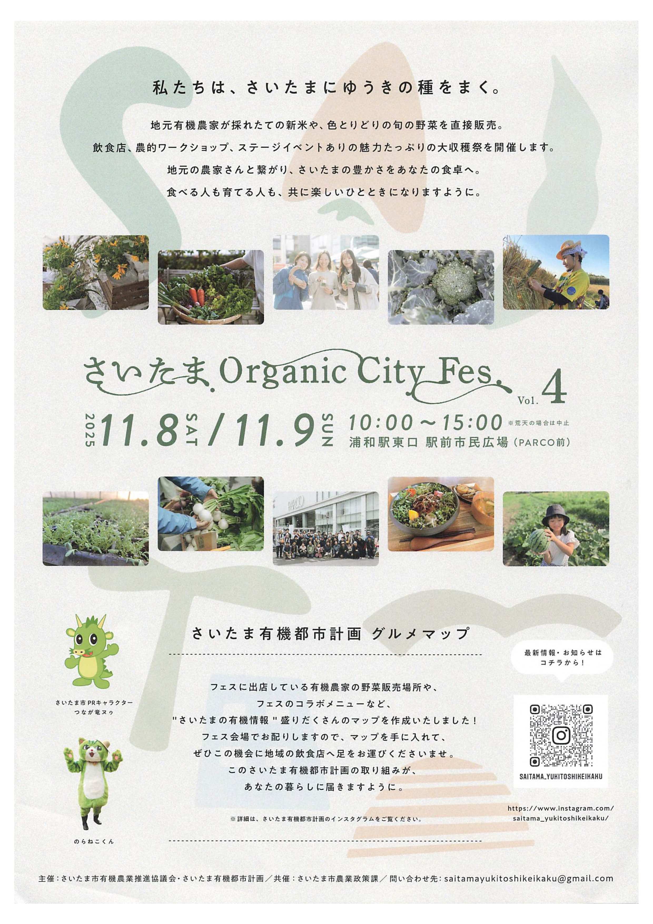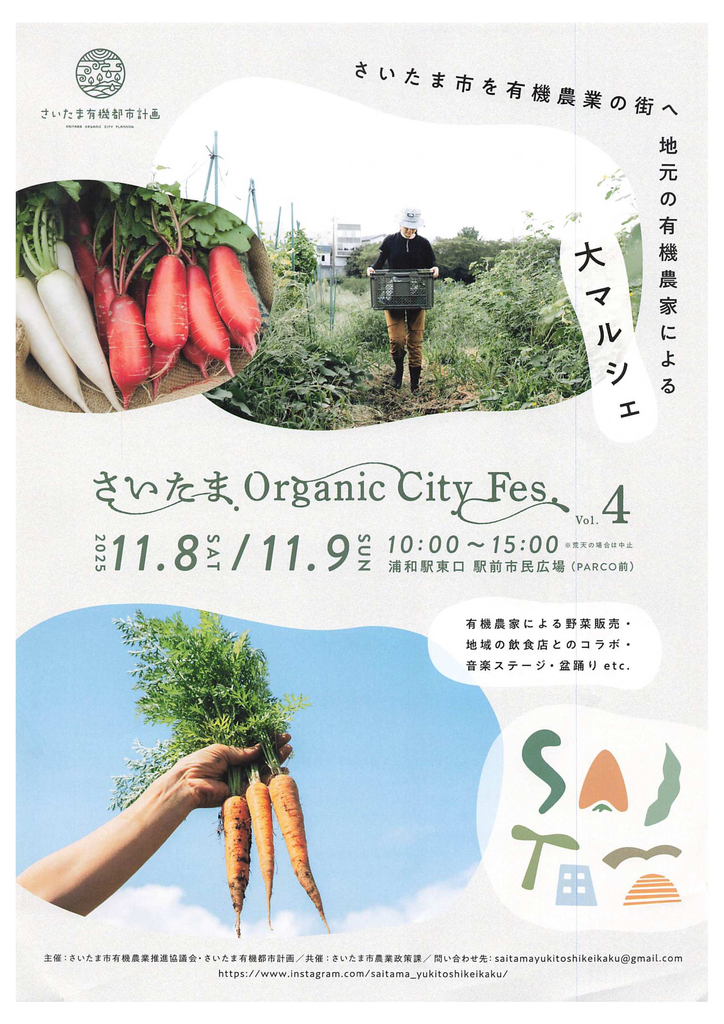 有機農業に携わる「さいたま市有機農業推進協議会・さいたま有機都市計画」が、浦和駅東口駅前市民広場(PARCO前)にて、地元の有機農家によるマルシェ「さいたま Organic City Fes.Vol.4」を開催します。