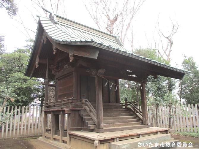二間社流造。銅板葺。桁行2.42メートル、梁間1.81メートル、庇の出1.59メートル。関係資料から、宝永5(1708)年8月に新宮殿として建立されたことが明らかとなっている。本社殿は、二間社と呼ばれる市内周辺の氷川神社に稀に見られる地域的特性を持った建造物の一つである。また、旧与野市域の中では、建造年代が判明している最古の社殿建築である。建立の翌年、宝永6(1709)年5月に遷宮が行われた時期を示す棟札も保存されている。 |