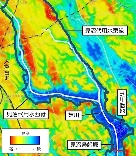 見沼通船堀は芝川低地と呼ばれる低地の中にあります。