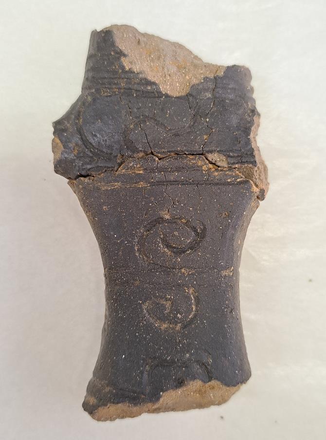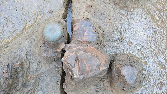 出土した口縁部破片は、7月に検出した破片と同一個体ですが、口縁部はそれぞれ別方向を向いていました。