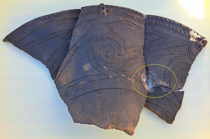 接合してみると、胴部右下に剥落痕があり、そこを起点に3枚に割れていることから、意図的に打ち割ったものと思われます(下写真黄色枠)。