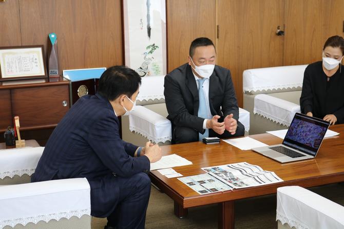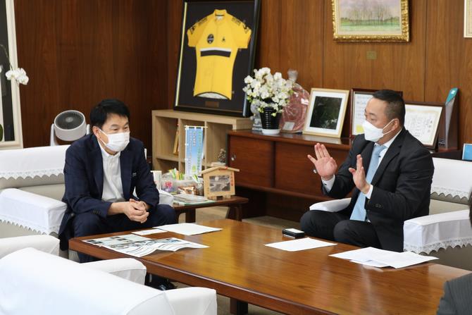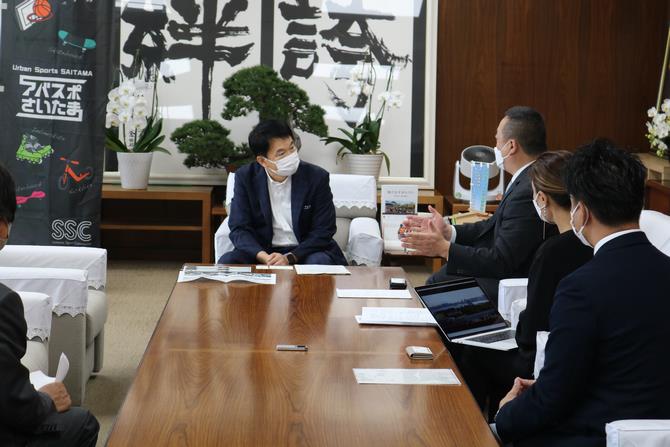 市長表敬訪問では、文平氏から「アーバンスポーツはもとよりスポーツ自体をどうすればエンターテインメントであったり、ツーリズムにつなげていけるかを考えながら、全国で様々なイベントを実施してきた」、「楽しむことを否定するのではなく、誰もがボーダーレスに肯定し合える場所を創ることを大切にしている」など、これまでの同社の取組や理念についてご説明を頂きました。