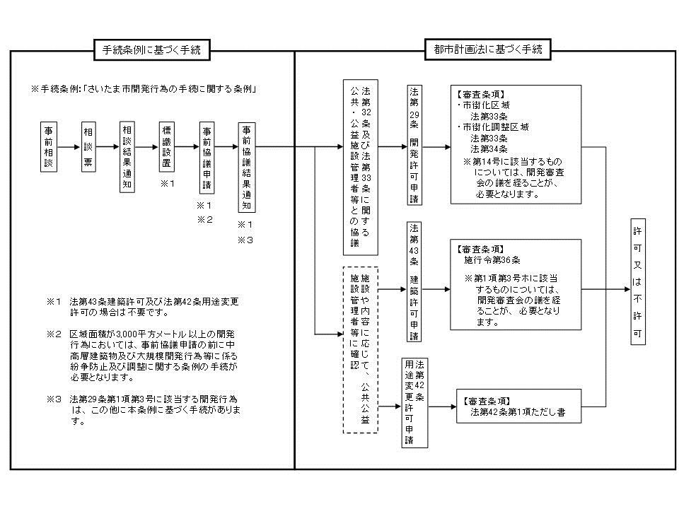| 技術基準 【法第33条】 (1)用途地域等 (2)道路、公園等 (3)排水施設 (4)給水施設 (5)地区計画等 (6)公共・公益施設及び予定建築物の用途の配分 (7)地盤の改良、擁壁設置等の安全措置 (8)災害危険区域等による適当でない区域 (9)樹木の保存、表土の保全等 (10)緑地帯、緩衝帯の配置 (11)道路、鉄道等による輸送上の立地 (12)申請者の資力、信用 (13)工事施行者の能力 (14)関係権利者の同意 |