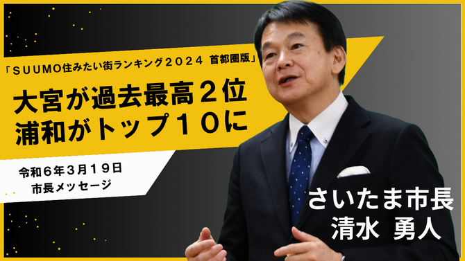 実際に、さいたま市は「住みやすい」、「住み続けたい」と思う方の割合は、ともに85%以上という高い水準を維持しています。こうした中、先日発表された「SUUMO住みたい街ランキング2024 首都圏版」では、【大宮】が2位、【浦和】が10位にランクインしました。【大宮】は3年連続のトップ3、そして過去最高順位となりました。【浦和】もトップ10に返り咲き、【さいたま新都心】も順位を上げるなど、市民だけでなく、市外の方々にも「住みやすいまち」という認識が定着してきたのではないかと考えています。