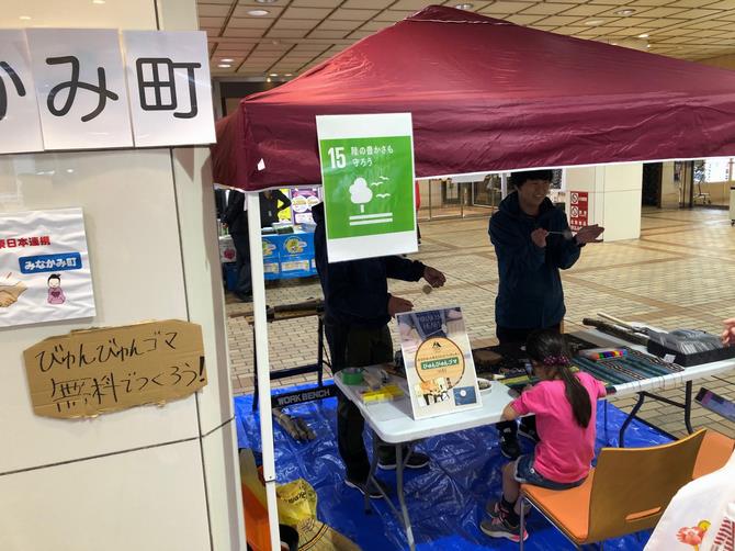 みなかみ町SDGs未来都市計画「水と森と人を育む みなかみプロジェクト2030」のほか、みなかみユネスコエコパークなど町の魅力の情報発信を行いました。また、みなかみ町の「木育の取組」(ゴール15)から、びゅんびゅんゴマを作って遊ぶ体験コーナーと、ラフトボートいっぱいのみなかみ町産「木のタマゴ」を持ってきていただきました。