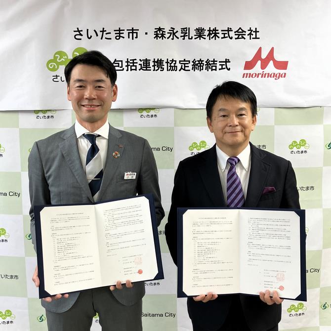 さいたま市と森永乳業株式会社は、それぞれの資源や特色を生かしながら、多岐にわたる分野において市民サービスの向上と地域の活性化を図ることを目的に、令和5年12月13日に包括連携協定を締結しました。