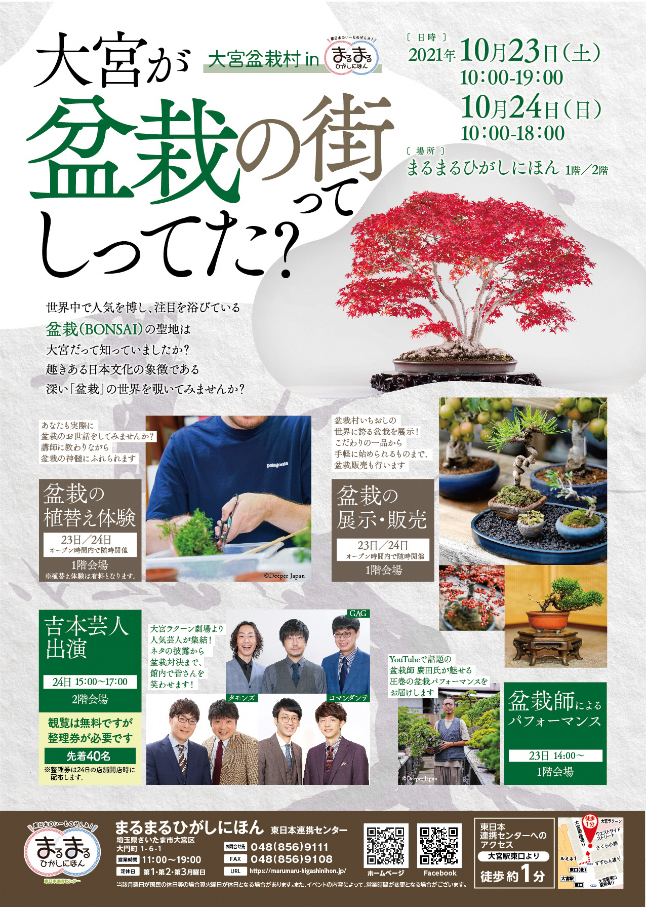 さいたま市の伝統産業並びに観光資源である、「大宮盆栽」をテーマにすることで、改めてその魅力に触れていただき、また若い世代にも盆栽を知ってもらうきっかけとして、「大宮が盆栽の街ってしってた?大宮盆栽村inまるまるひがしにほん」を大宮駅東口徒歩1分のまるまるひがしにほんで開催します。