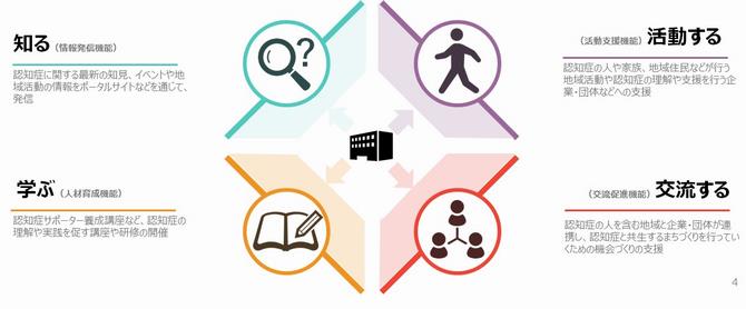 認知症の人や家族、地域住民などが行う地域活動や、認知症の理解や支援を行う企業、団体など様々な主体の社会参加やサービスの創出などの活動をするための相談窓口を開設し、支援を行っていきます。