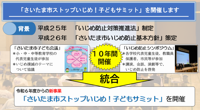 本年度から、2つの取組のよさを生かしつつ統合させた「さいたま市ストップいじめ!子どもサミット」を新たに開催します。