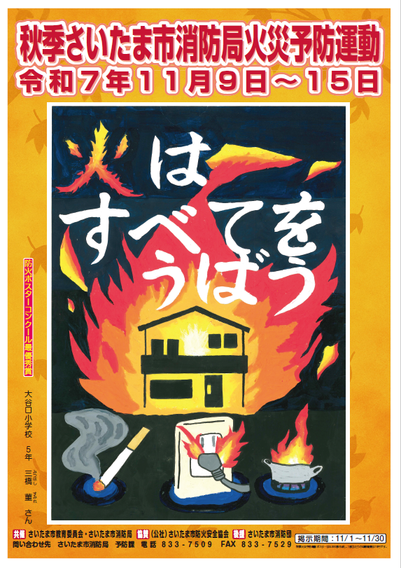 また、令和7年度防火ポスターコンクールで最優秀賞を受賞した6作品のうち、3作品を期間中のポスターとして使用し、最優秀賞を含む入賞作品すべてを市内公共施設・商業施設等で展示します。
