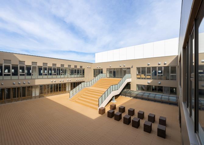 本校は、過大規模校の解消と教育環境の充実を目的として設置し、文部科学省が令和4年3月に提示した「新しい時代の学びを実現する学校施設の在り方」の考えを踏まえ、多様な学習活動を展開できる教室空間を整備しました。「学校」・「保育園」・「放課後子ども居場所事業」が一体となった複合施設として整備し、地域に開かれた学校として幅広い利用が可能です。また、プールは「屋内温水プール」として整備しており、近隣の小中学校との共用だけでなく、学校教育に支障のない時間帯は地域の方にもご利用いただけます。さらに、災害時には防災拠点として地域を支える役割も担います。