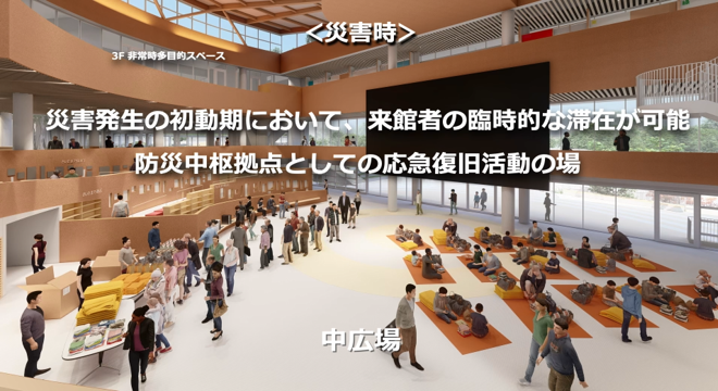 中広場は天候に左右されず一年中快適に過ごすことができ、大型ビジョンや移動観覧席の設置により、市民が一体となって楽しめる多様な催しを開催できる空間を形成します。