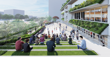 緑豊かな外広場と階段広場が連続し、日常的に市民が集まれる居場所をつくるとともに、様々なイベントの開催によってにぎわいを生み出し、活気ある空間を形成します。