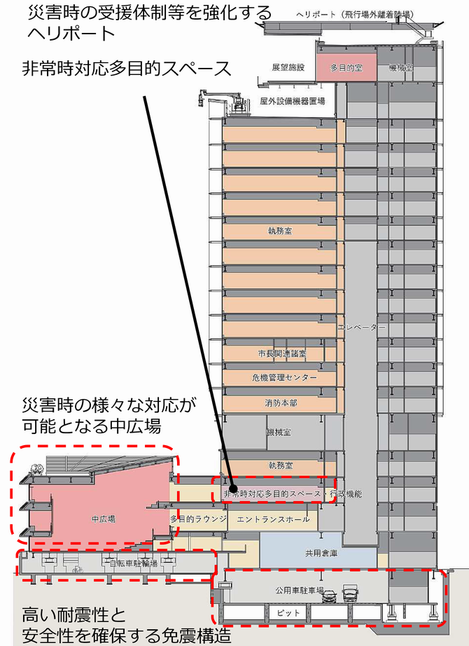 免震構造により高い耐震性と安全性を確保し、 区役所等の代替スペースや行政機能の継続を実現する非常時対応多目的スペースや災害時の受援体制等を強化するヘリポートを整備します。また、非常用発電設備や受水槽などの設置により最大7日間の事業継続が可能となります。
