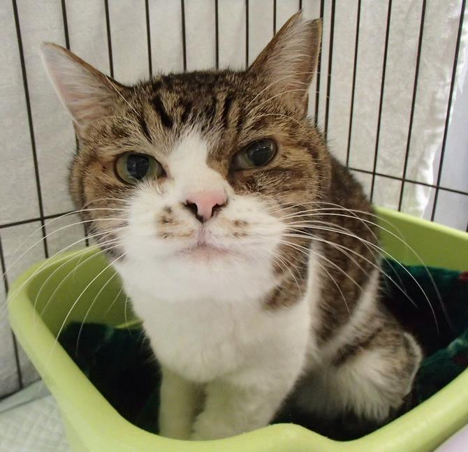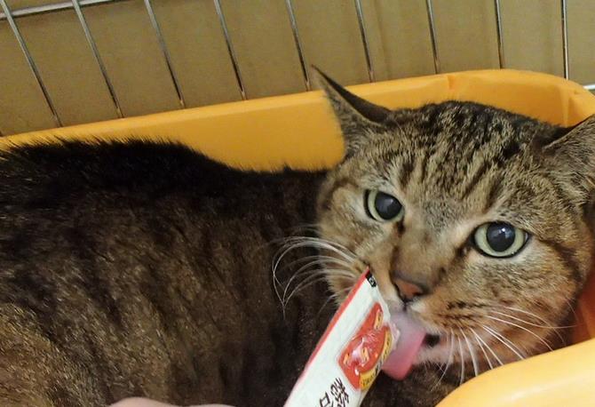 特徴:左頬骨を骨折していますが、ご飯も食べれるようになり、元気に過ごしています。骨折の影響か、舌が少し出ていることが多いです。鼻血まじりの鼻水が出ているため、ネブライザー療法を行っています。人が大好きで、他の猫に構っていても撫でてほしくてアピールしてきます。猫エイズ陽性です。