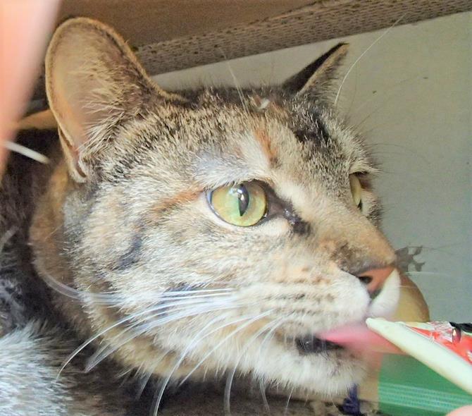 特徴:唾が飛ぶほどシャーで威嚇しますが、小声でキャーキャーと鳴きます。人間が怖いのにケージ手前で待ち伏せています。右側に少し麻痺があり、攻撃する場合は左手で実行します。猫は好きなようで、特にすみくんのことが大好きです。人間の指からちゅーるが出てくると思っているふしがあり、指を前歯で咬んでこし出そうとしてきます。他の猫のごはんを盗みます。猫エイズ陽性です。