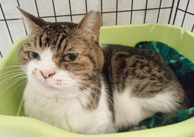特徴:赤ちゃん猫の頃に収容されたので人馴れは抜群です。生まれつき胸部が扁平で胸腔が狭く、小さい頃は呼吸がやや荒かったので酸素室で暮らしていましたが、現在は酸素室の外で過ごせます。両後肢にも異常があるため引きずっていますが、前肢で素早く動きます。排尿排便の介助が必要です。最近は猫じゃらしがブームです。