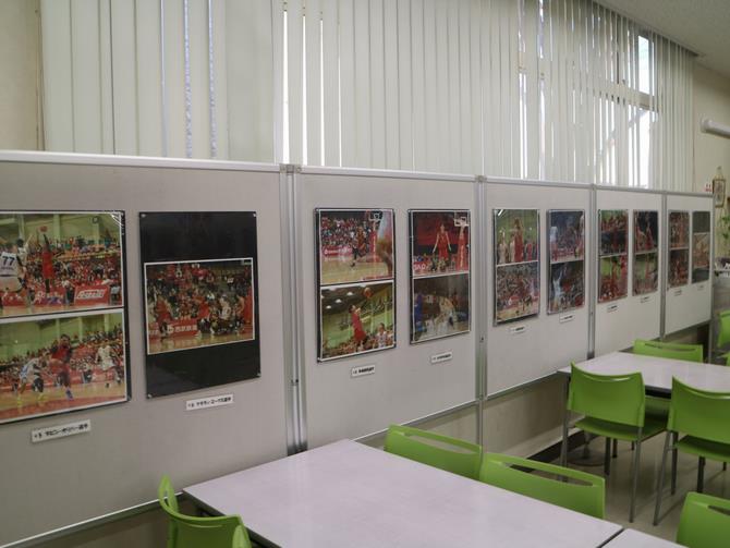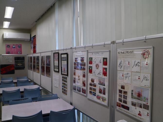 今月はさいたま市をホームタウンとするプロバスケットボールチーム「さいたまブロンコス」の写真展です。ブロンコスの選手の写真、白熱した試合の様子や選手のサインなどの展示をしています。