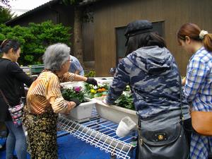 この日は、大戸西自治会の皆さんによる花の植栽活動が行われました。大戸西自治会では、年3回、通学路をプランターに植えた花で彩り、地域の皆さんの目と心を楽しませる活動を通じて安心・安全なまちづくりを行っています。いつもながら、手際よくプランターに入れる土を作り、皆さんで花を植えていきます。作業台など道具はすべて手作りだそうです。