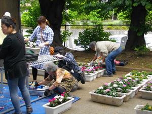 この日は、稲荷町・寿町・旭町自治会の皆さんによる花の植栽活動が行われました。ベゴニアとポーチュラカの花苗を、プランターに植えていきます。