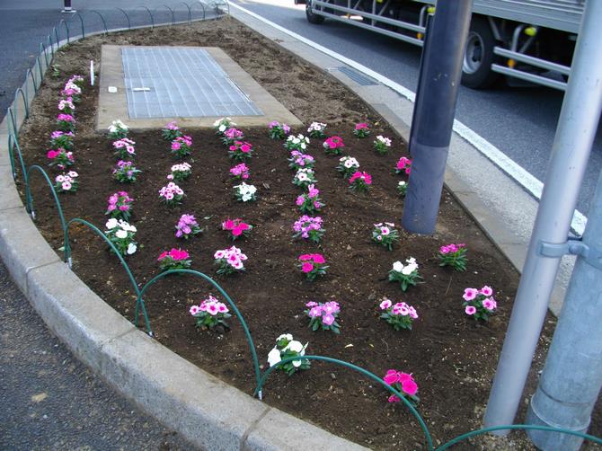 きれいに植え付けが終わり、水をたっぷりとかけてあげました。歩道を通りかかる方から、「きれいですね」とよく声をかけられるそうです。花をとおしてコミュニケーションの輪が広がっています。国道沿いの目につくところなので、多くの方に安らぎを与えてくれています。