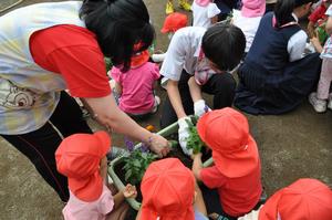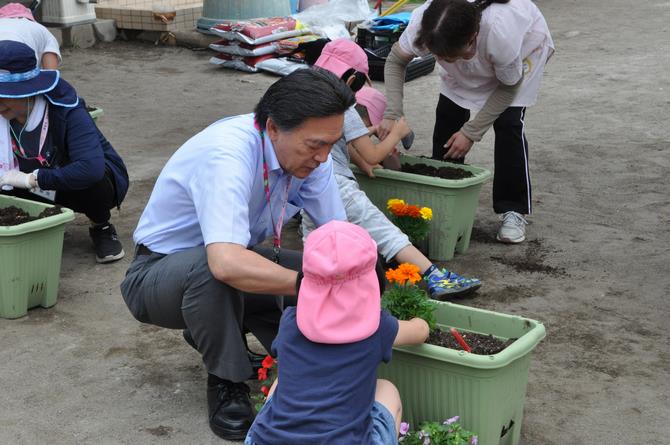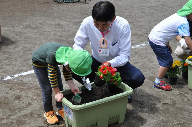 大戸保育園は今回が初めての花植えです。区民生活部長もお手伝い。みんなで楽しく花植えを行いました。