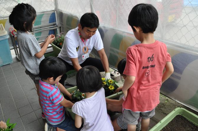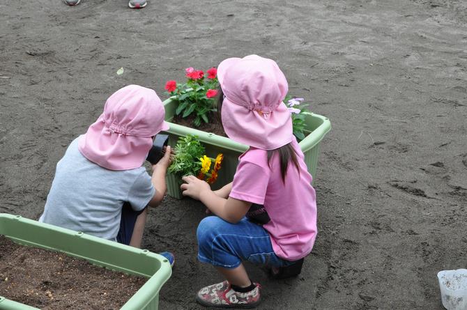 今回は5歳児と4歳児の園児が花植えを体験しました。