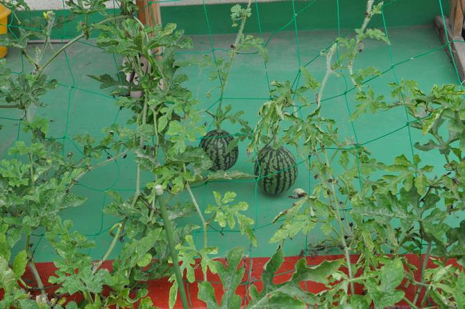この園では園庭にたくさんの野菜等を育てていて、すいかはかわいらしい実をつけていました。