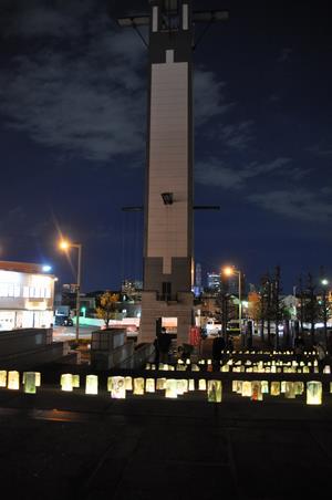 大階段には、思い思いの絵や言葉が描かれたキャンドルシェードが約250個並べられました。