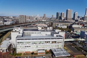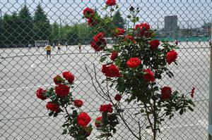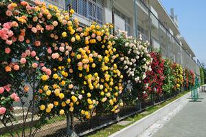 与野南中学校には、北側と西側の道路沿いのフェンスや校舎南側のフェンスなどにたくさんのバラが植えられています。