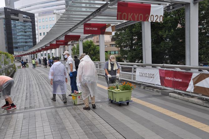 北与野駅から東京2020オリンピックバスケットボール会場のさいたまスーパーアリーナへ続くデッキ上に設置してあったプランターの撤去作業が行われました。