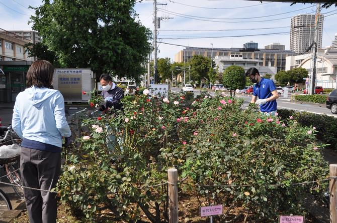 9月13日に中央区バラサポーターの井原会長の指導の下、近藤区長をはじめとする職員数名で区役所周辺のバラの剪定作業を行いました。